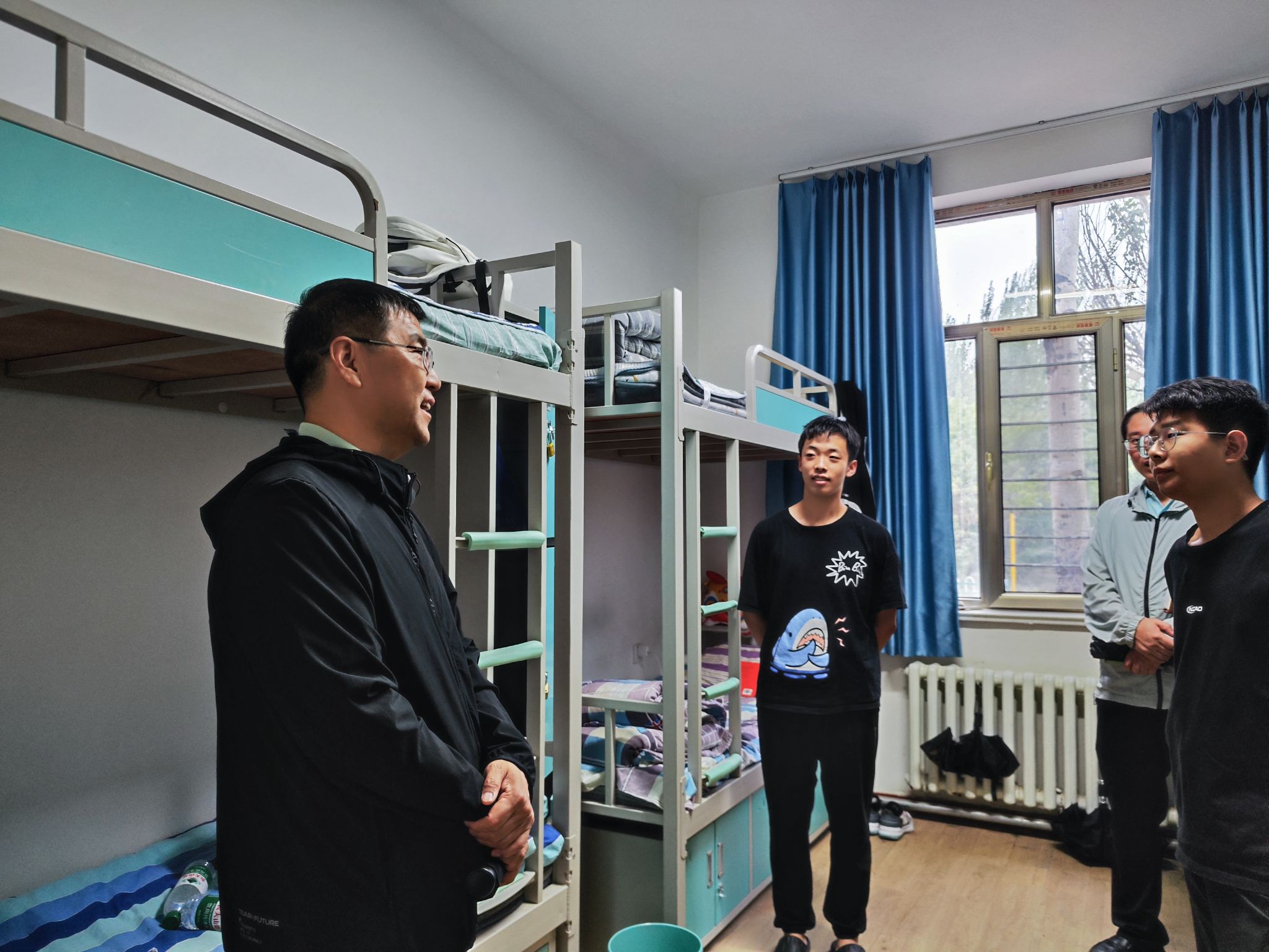 老师们逐一深入宿舍,向新生们致以亲切的问候,并询问了同学们初入大学的适应情况。在交流中,段志峰书记鼓励同学们面对新生活、新环境、新朋友要活泼积极,尽快融入矿煤大家庭中来。同时他强调说,宿舍不仅是学习生活的场所,更是大家共同成长的小家,遇到问题时,要及时向辅导员、班主任寻求帮助和支持。