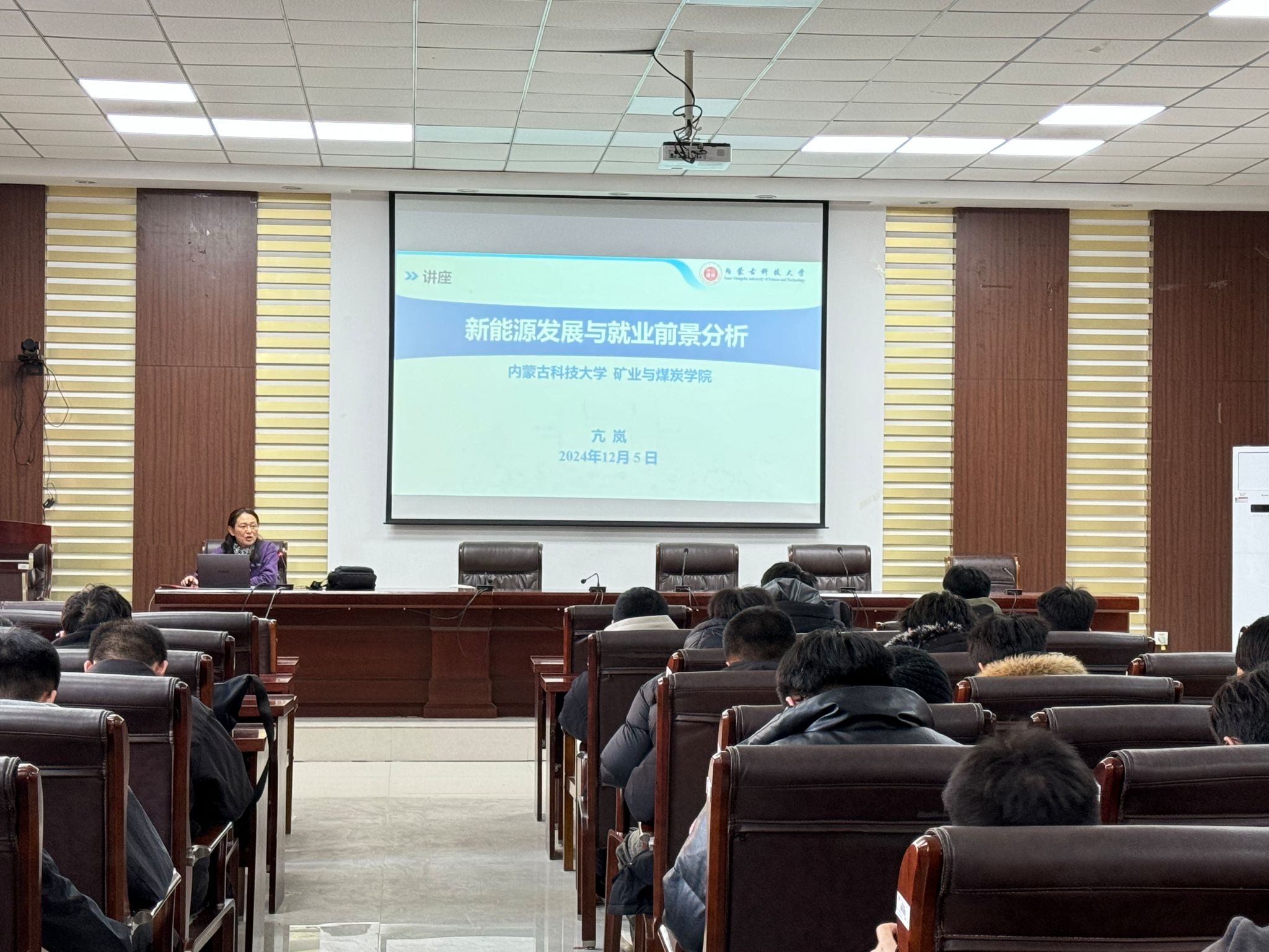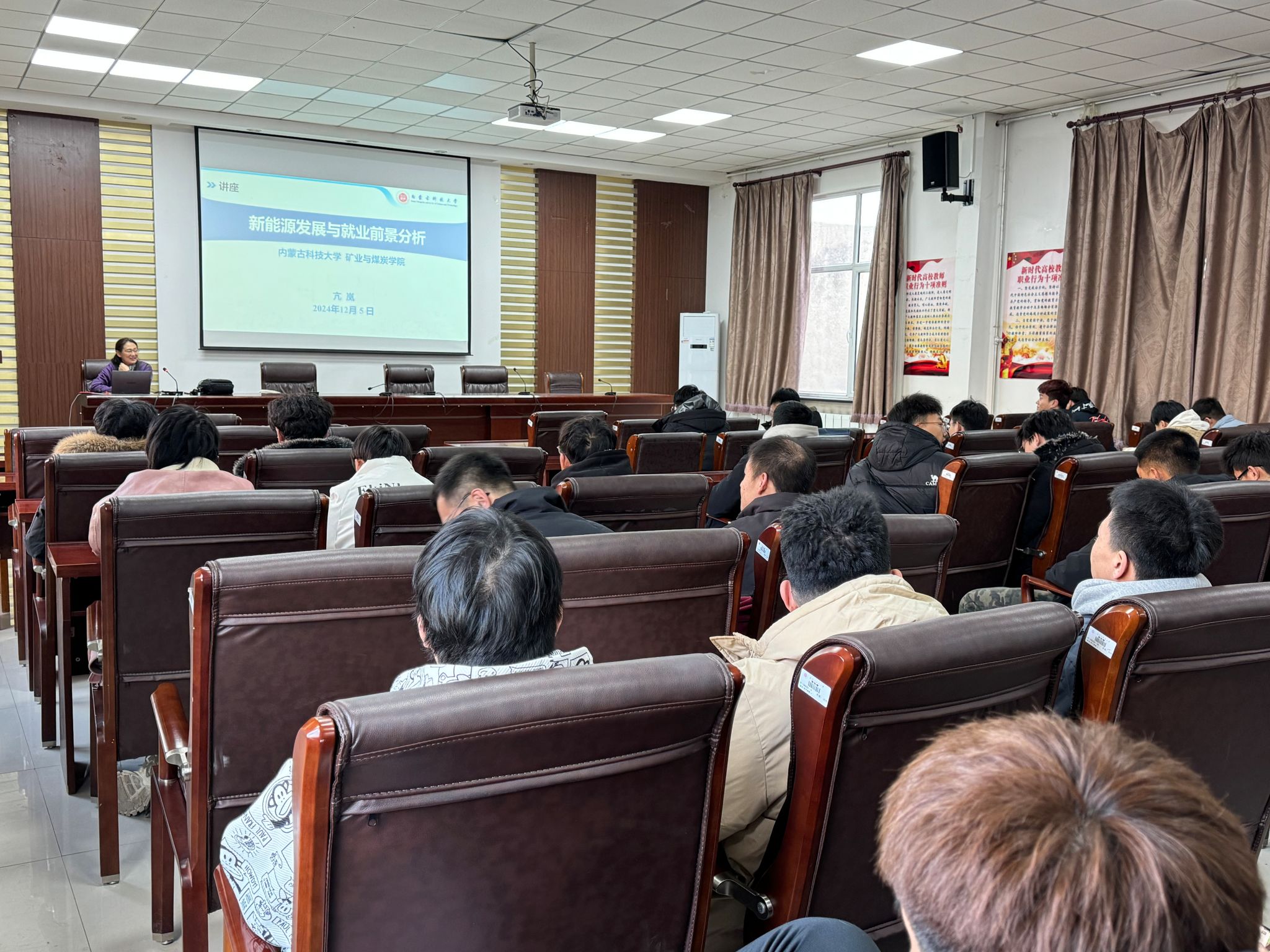 2024 年 12 月 5 日下午 16:00,太阳集团tyc539在实验室训楼二楼会议室举行讲座,机电工程系教授亢岚主讲,矿山机电专业三个年级及电气自动化、机电一体化专业毕业班学生踊跃参与,主题为“新能源发展与就业前景分析”。
