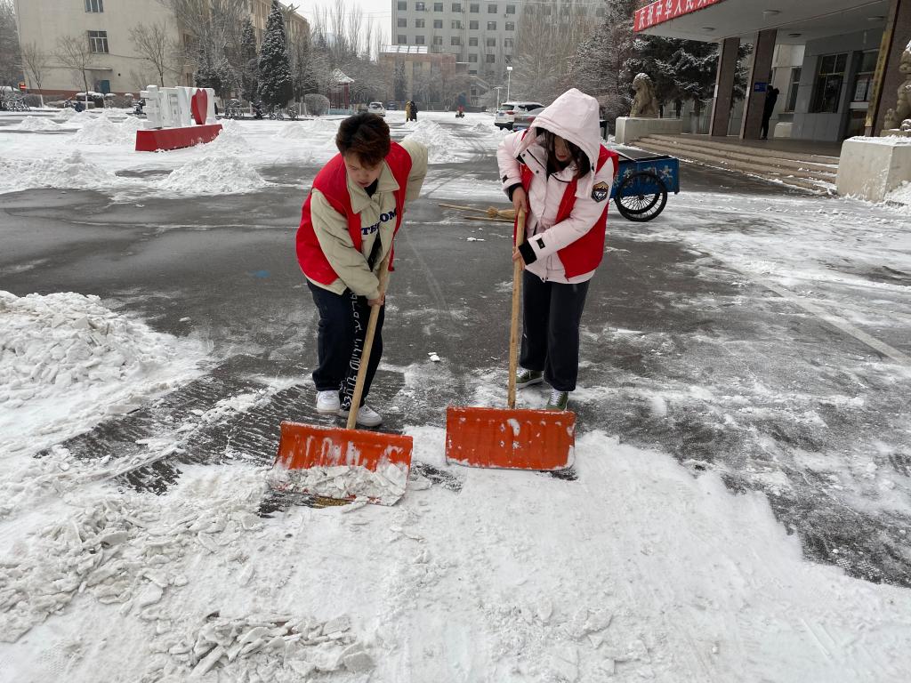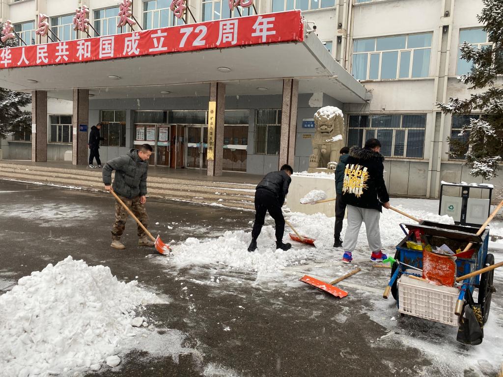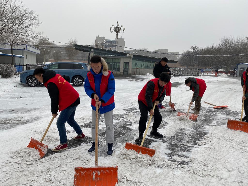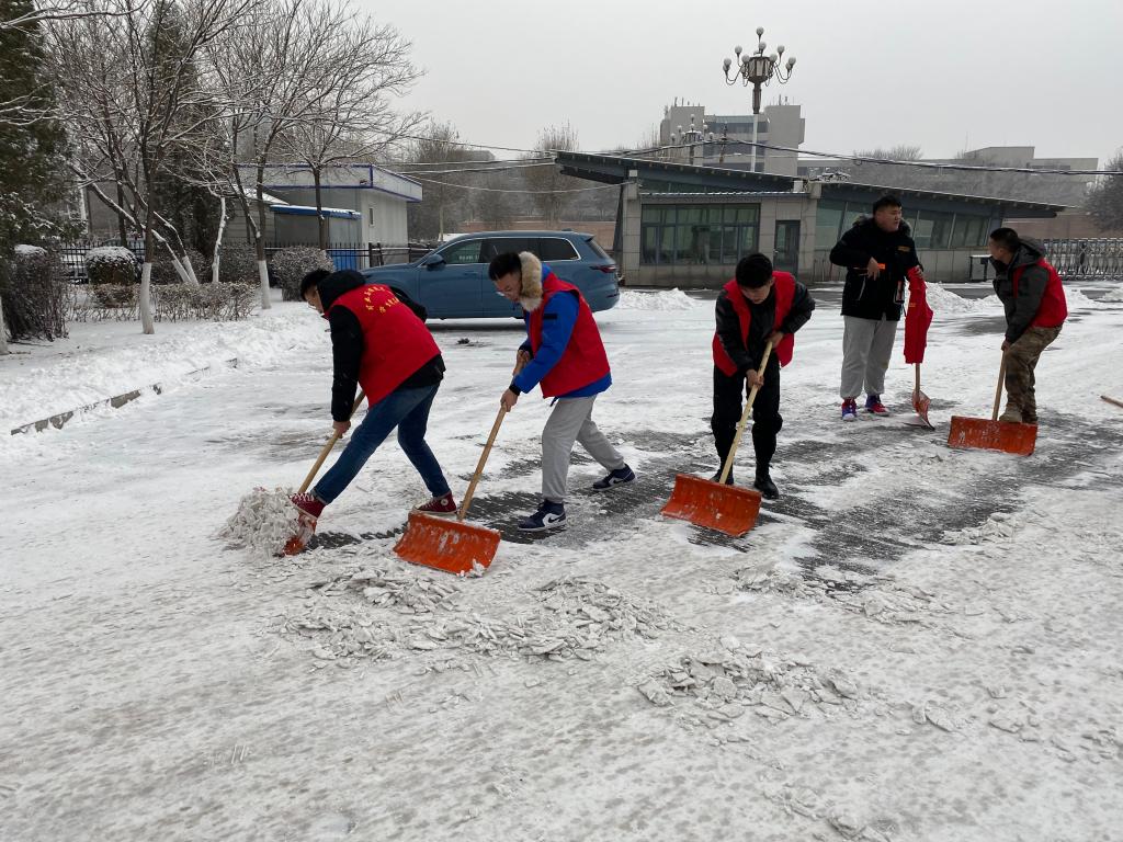 确定除雪位置,划分负责区域,同志们洋溢的热情,冲淡了雪后的凌冽寒冷。大家分工合作,有人负责把坚硬的雪层铲下,有人负责把铲出的雪块堆成一堆,有人则负责将雪堆推到路边,大家相互配合着,互相提醒着注意躲开来往车辆,每个人都投入其中。