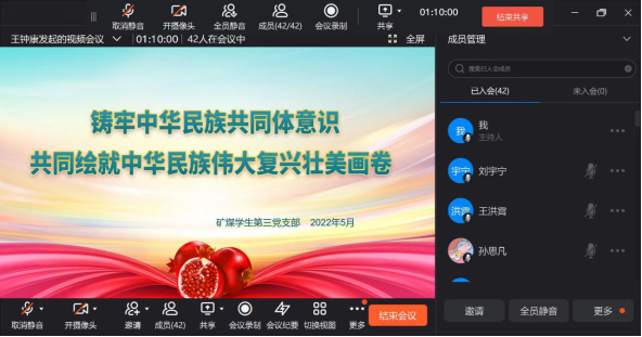 2022年5月27日晚18:00,太阳集团tyc539学生第三党支部于钉钉平台召开党员党课学习,本次学习的主题是:铸牢中华民族共同体意识,共同绘就中华民族伟大复兴壮美画卷。领学人:闫妍同志。