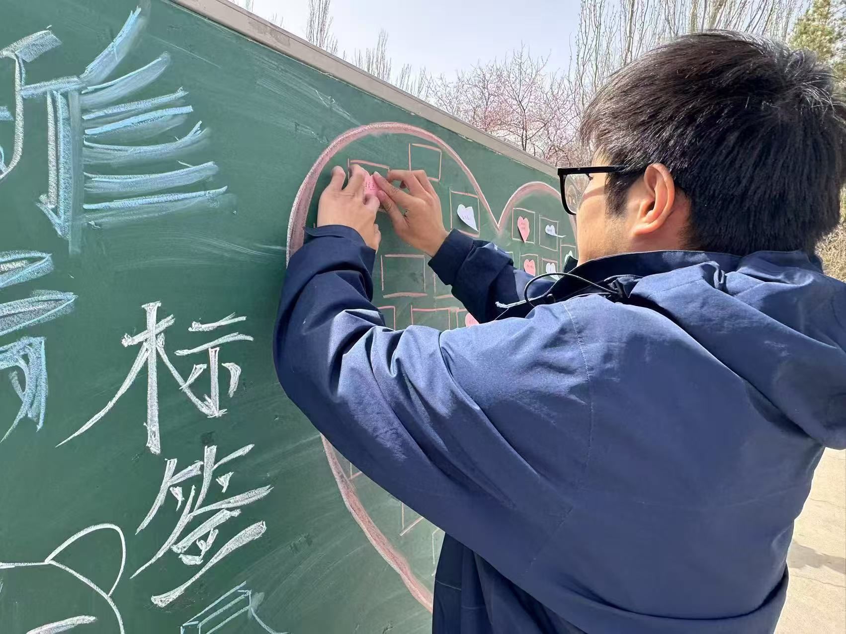 部分同学认真地写下自己的签名,希望能在这场意义非凡的心灵约会中留下专属的深刻印记;有些同学选择与自己书写的标签合影打卡,祈愿未来的自己能够始终秉持自爱之心。一个个标签贴上去组成了一个大爱心,引得路过同学驻足拍摄。